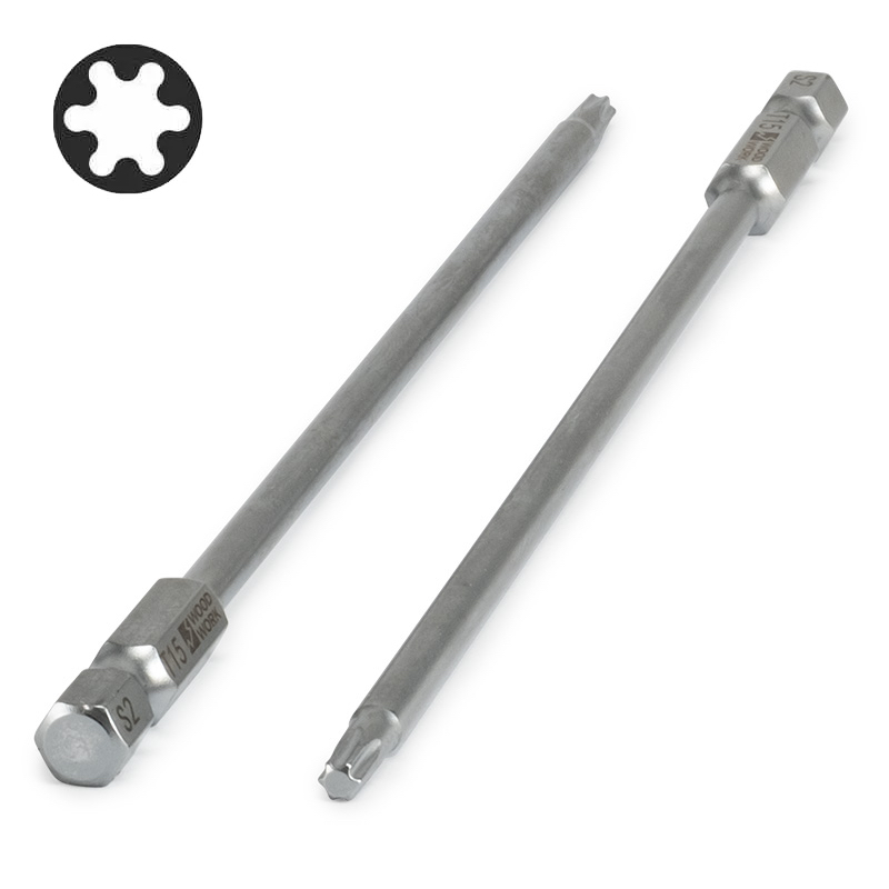 • сталь S2 - специальная легированная сталь, считающаяся наилучшей для стержней отверток и бит, которая по сравнению с хромванадиевой сталью, содержит молибден, кремний и повышенное содержание углерода, благодаря чему биты обладают повышенной твердостью и имеют высокий предел разрушения при деформации на изгиб